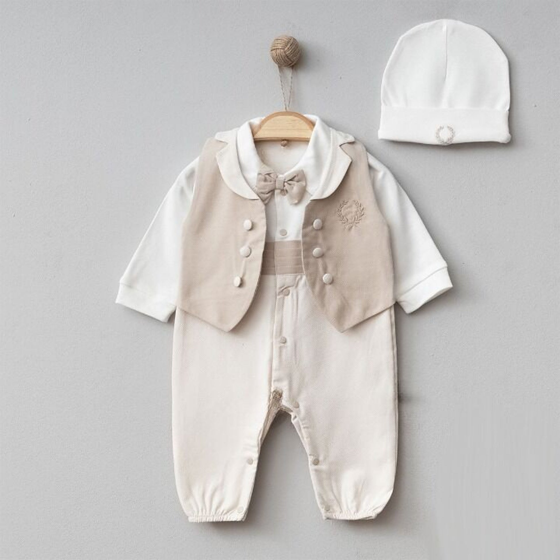 Offrez à votre petit garçon un style élégant avec notre Kidbilet spécial ! Cet ensemble deux pièces comprend une salopette à pieds avec un nœud papillon et un chapeau assorti. Fabriqué en coton de qualité, ce costume est parfait pour les occasions spéciales et les photos de famille. Disponible en trois tailles, de 0 à 9 mois. (Ne pas blanchir, sécher, repasser à l'envers, utiliser un détergent doux et faire preuve de style !)