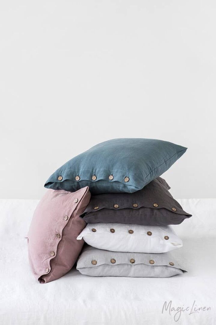 Ensemble de taies d'oreiller en lin fait main, avec boutons. Ajoutez une touche douce et confortable à votre parure de lit. Facile à assortir avec d'autres couleurs pour s'adapter à différents styles d'intérieur. Fabriqué en Lituanie avec des matériaux éco-responsables, pour une option durable et élégante.