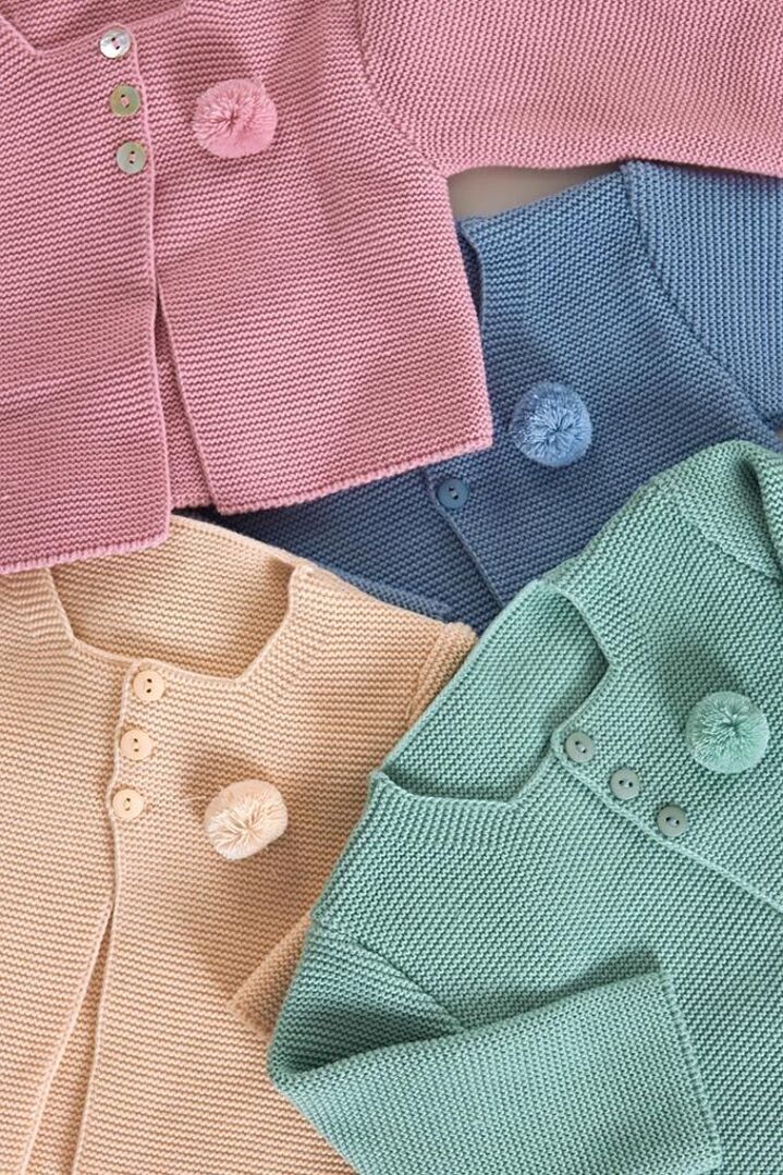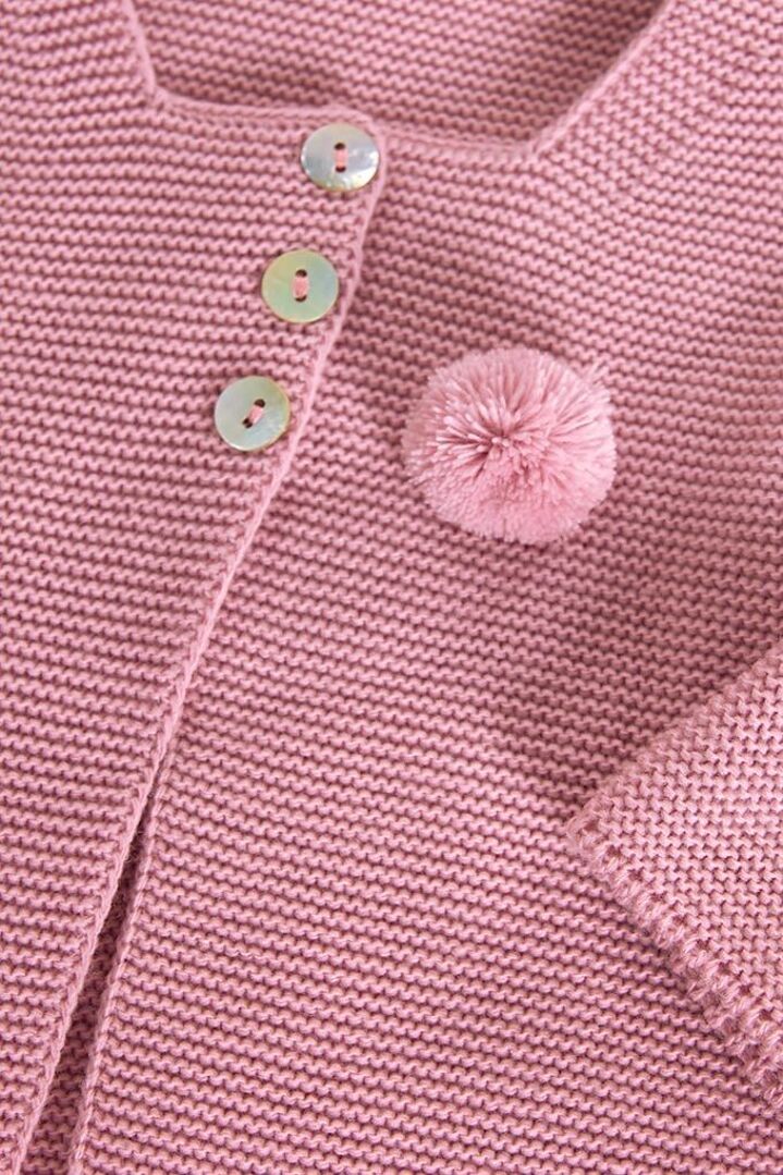 Veste réalisée en tricot acrylique avec pompon et ouverture devant avec boutons en plastique.