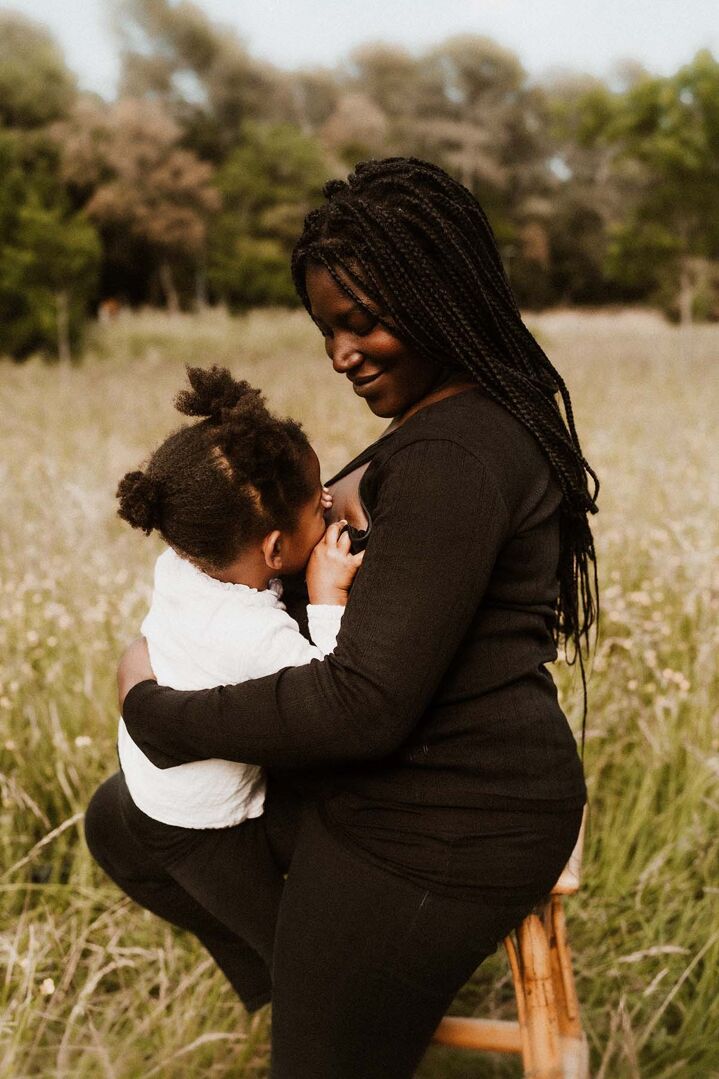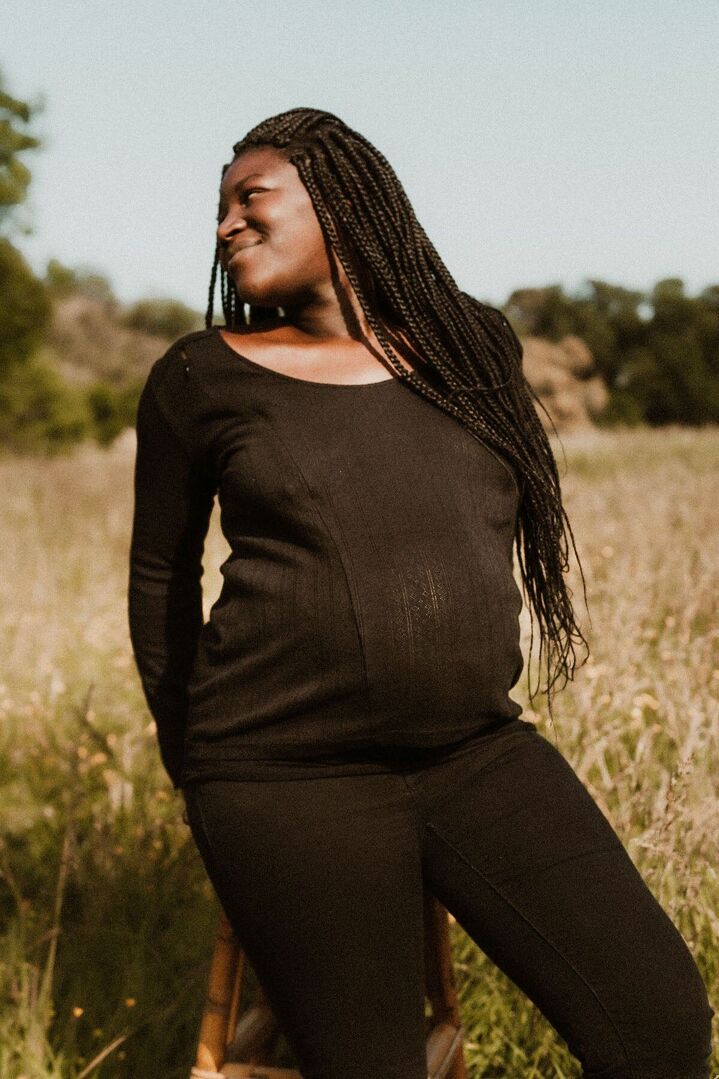 TS noir : Sadio mesure 1m64 et porte le t-shirt d’allaitement Mama Mia en taille L