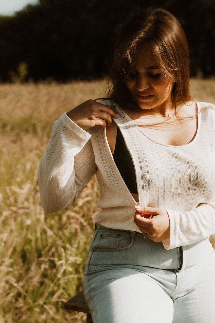 Cette pièce féminine combine la délicatesse de la maille pointelle et une coupe ajustée, mettant en valeur vos formes après la maternité. Parfaite pour les tétées quotidiennes, elle se marie facilement avec votre jean préféré pour une silhouette féminine et tendance.