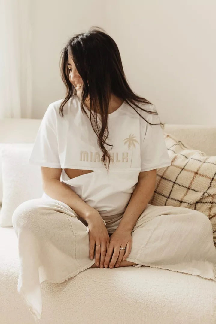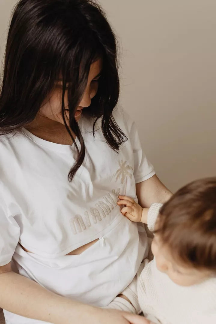 Sentez les saveurs d’été avec ce t-shirt aux motifs palmiers et plages, évoquant le sable chaud et les tétées à l’ombre d’un parasol ! Facile à porter avec votre jean préféré, ce t-shirt est conçu pour simplifier la vie des Mamas.