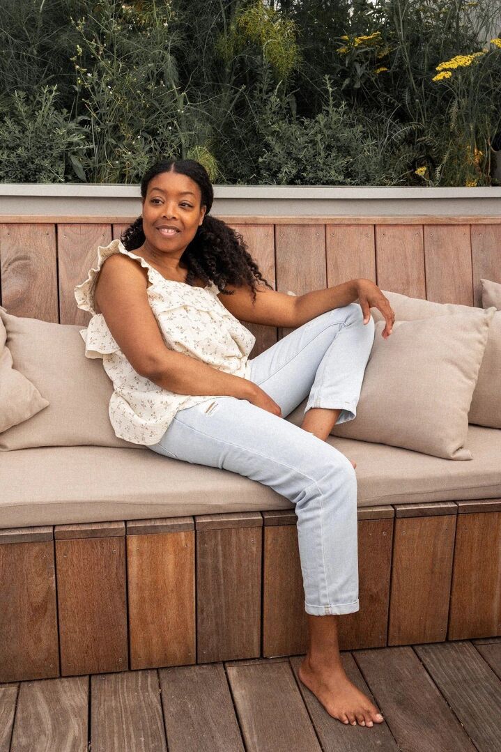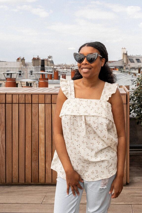 Laetitia mesure 1,57 m et porte le top d’allaitement Summ’her Mama en taille M.
