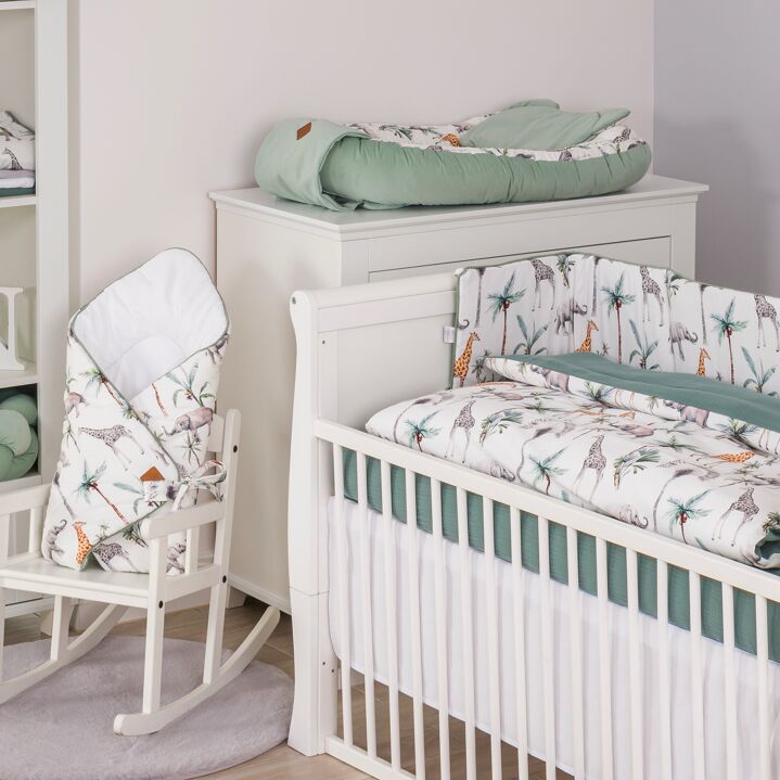 Découvrez la Collection Safari pour votre enfant ! Avec ses imprimés d'animaux et de palmiers, ainsi que sa douce mousseline gaze de coton, vous serez séduits par son design délicat et coloré. Agrémenté d'un joli liseré vert d'eau, ce linge de lit moderne offre un confort optimal pour de belles aventures durant le sommeil de bébé.