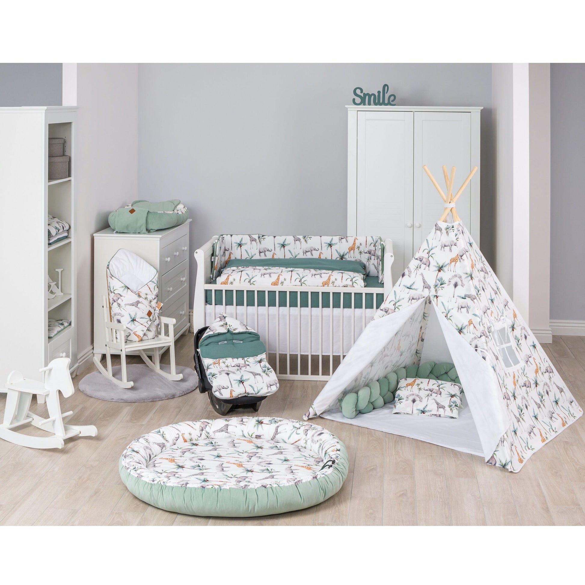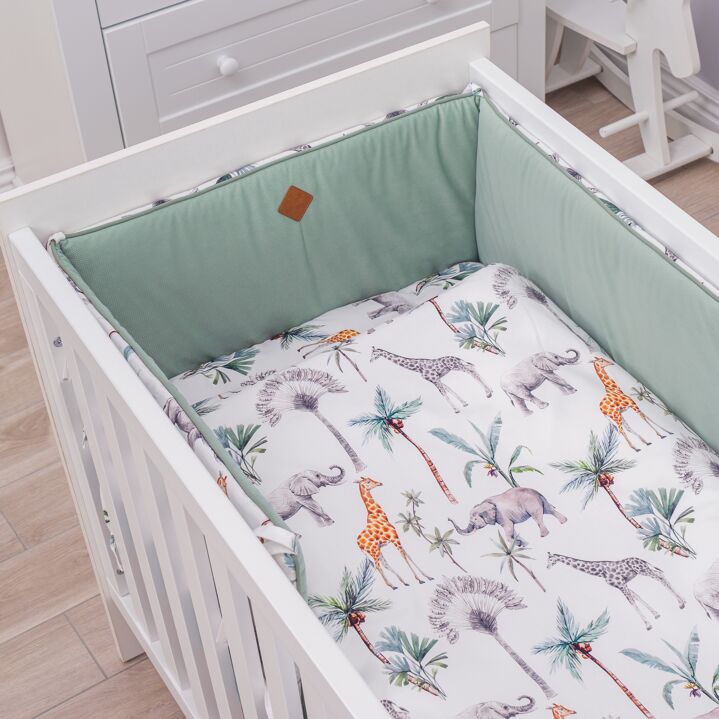 Le design délicat et coloré de la Collection Safari est irrésistible. Avec ses jolis imprimés d'animaux et de palmiers, il promet de belles aventures pendant les doux sommeils de Bébé. Ce linge de lit moderne, à l'esprit jungle, est sublimé par un liseré vert d'eau, garantissant un confort optimal.