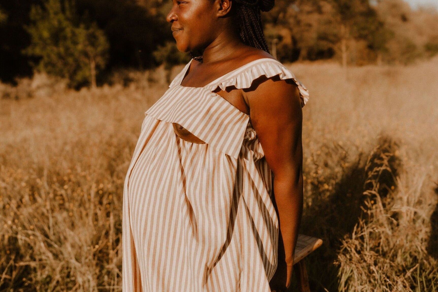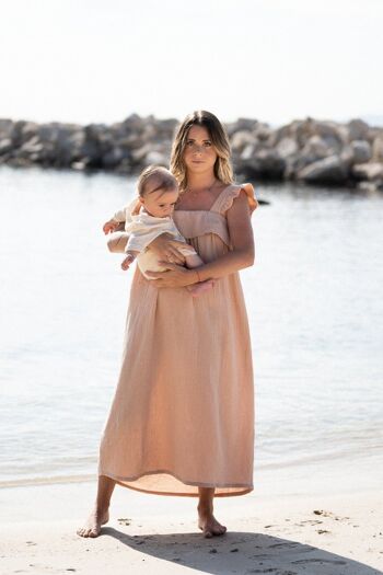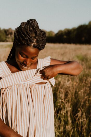 Sadio mesure 1,64m et porte la robe d'allaitement camel en taille L