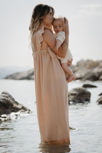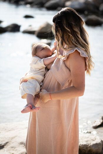 Découvrez la robe Kidbrobe longue d'allaitement, conçue pour être votre alliée pendant le post-partum et les 9 mois de proximité avec bébé. Son tissu léger et confortable est accompagné d'ouvertures discrètes pour allaiter en toute discrétion. Elégante avec son volant devant, elle s'adapte à votre corps avant et après l'accouchement.