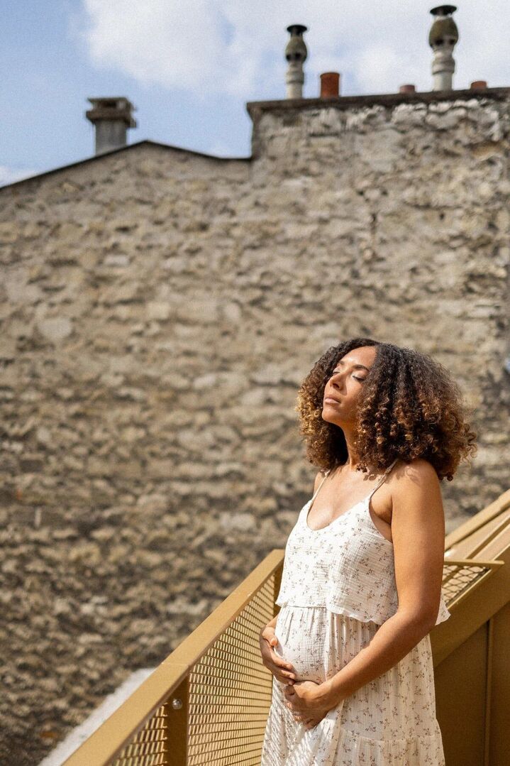Maureen mesure 1,66 m, est enceinte de 5 mois, et porte la robe d’allaitement Summ’her Mama Nude en taille M.