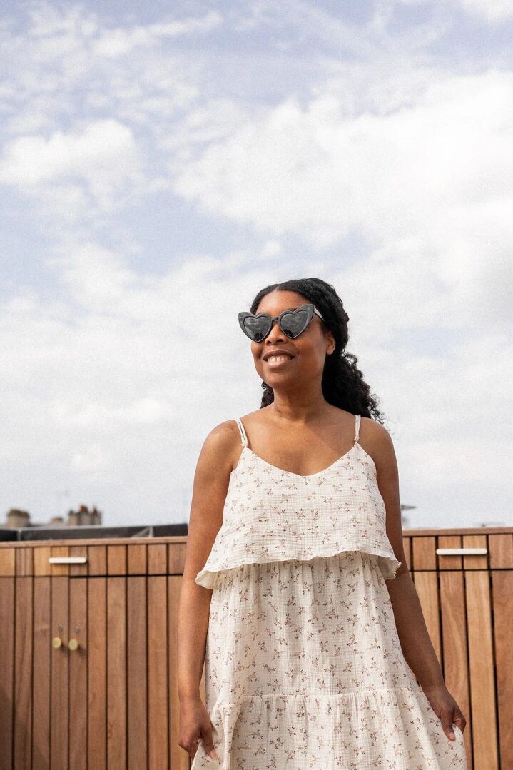 Laetitia mesure 1,57 m et porte la robe d’allaitement Summ’her Mama Nude en taille M.