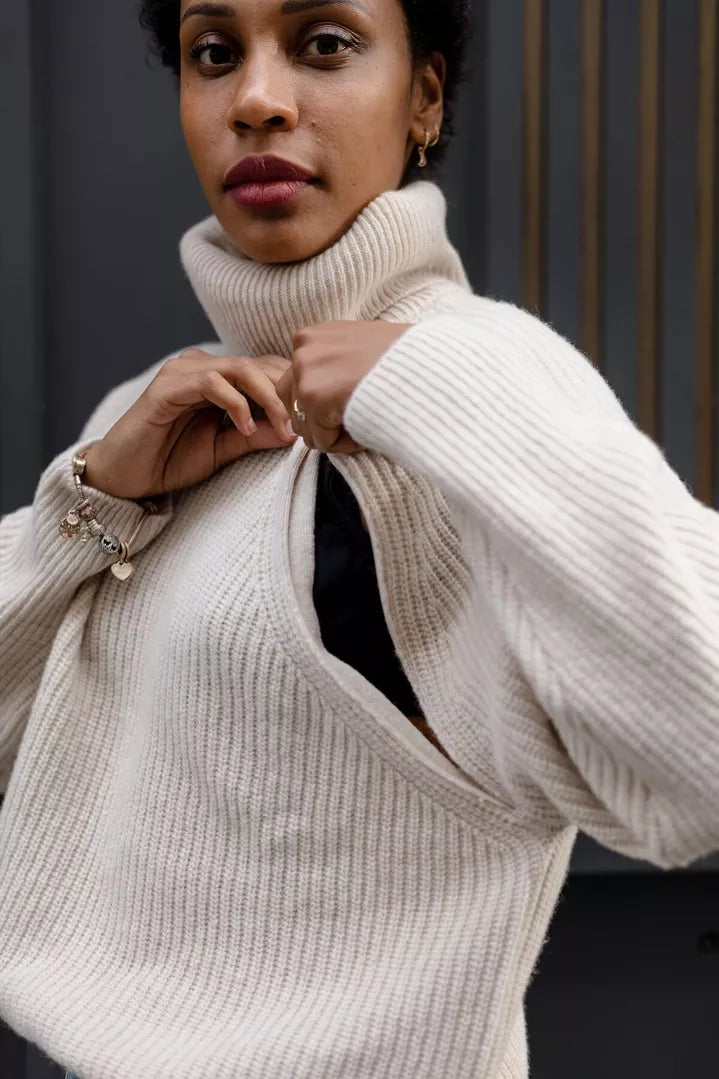 Parfait pour le dressing des Milk Mamas (ou non, car vous pouvez le porter même après la période d'allaitement), ce pull est en 100% laine mérinos et vous permet d'allaiter en toute liberté grâce à ses ouvertures ingénieuses !