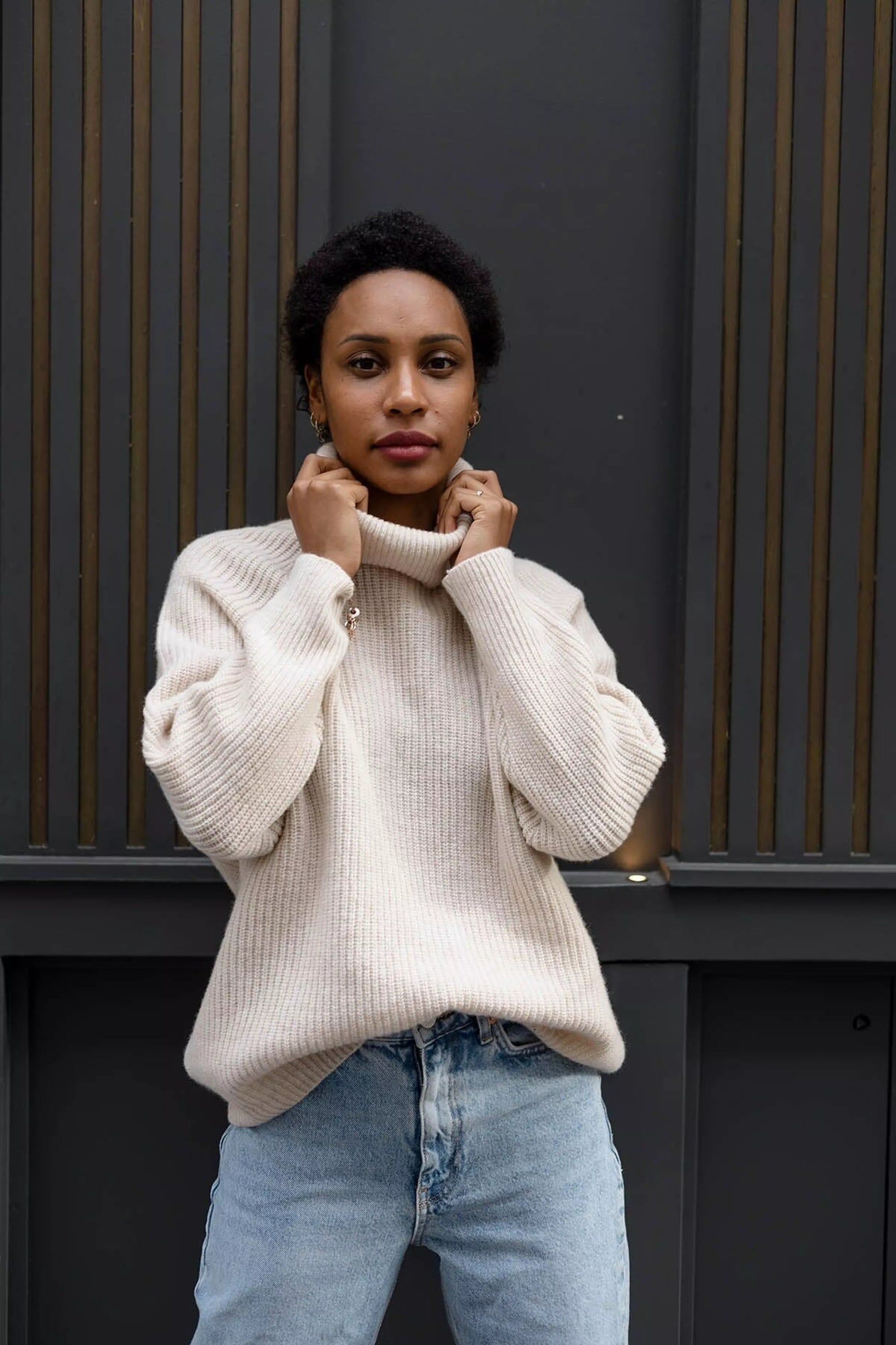 Sheinora mesure 1,63 m et porte le pull Sweet Mama beige en taille S.