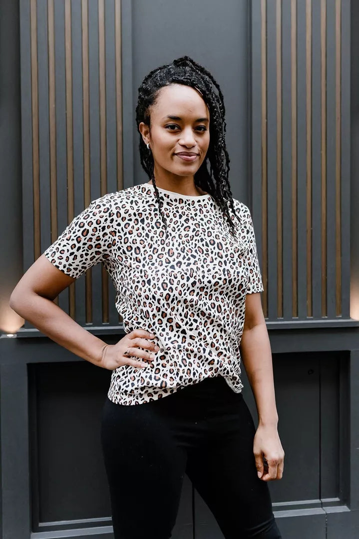 Le T-shirt d’allaitement léopard taille bien, prenez votre taille habituelle (sauf si vous souhaitez le porter très loose).