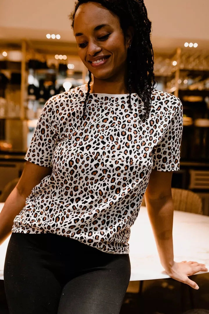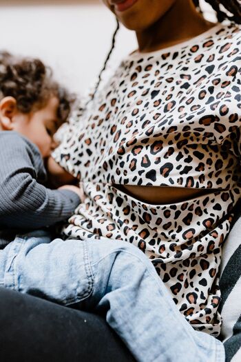 Découvrez le Kidshirt d'allaitement léopard, conçu pour offrir un confort optimal pendant vos tétées grâce à sa coupe mi-loose mi-ajustée.